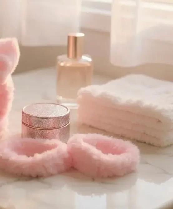The Heaven’Ly Pink Plush Spa & Beauty Headband Set includes our signature Pink Plush Spa & Beauty Headband along with two matching plush wristband hair ties. The headband keeps your hair gently secured away from your face, while the wristbands prevent water, serums, or mask residue from running down your arms during your skincare routine.
